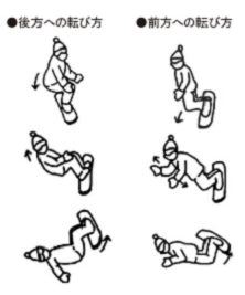 Learning how to fall beforehand will reduce the risk of injury and also reduce fear. 1. When falling backwards, lower your upper body, round your back, and raise your head to avoid hitting the back of your head. 2. When falling forward, place your knees on the snow and support your body with your arms spread out beyond your shoulders. In either case, raise the board so that it does not dig into the snow. 3. When jumping, the basis is to take off correctly while maintaining balance. When landing, try to match the angle of the board to the slope as much as possible. If you land on your tail, the recoil will cause you to lose balance.