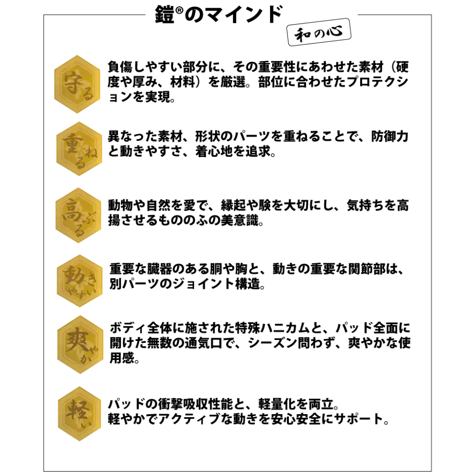 The key concepts of the surface of YOROI® as an ultra-high performance protector are the high shock absorption, breathability, and comfortable fit mentioned above. However, there is a concept behind it that should not be overlooked. It is the spirit of harmony. The spirit is culture and is connected to history. It was named "Yoroi" because armor was born in the spiritual culture of Bushido, which can be said to be the pillar of Japanese culture, and is a symbol of historical culture that was developed and evolved to protect the lives of samurai. The invisible historical culture, the spirit of harmony, is attached to the back of the protector, which is modeled after armor. Visible objects do not exist only as objects. Invisible culture, history, that is, the spirit is attached to it. The concept of the spirit that flows underneath "YOROI®" is the Japanese spirit.