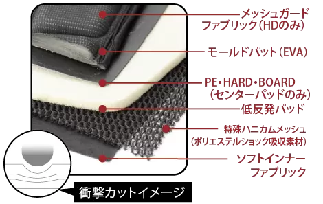 The cross-section of the pads in important areas is shown in the figure above, and they are multi-layered. Like ancient armor, they are made up of several different materials. Starting from the parts closest to the body, they are made of sweat-absorbing, quick-drying soft inner (types vary depending on the model), a special honeycomb mesh with shock absorption, memory foam pad, PE board (only in the center of the back and center of the hips), and molded pad. The molded pad comes in three types of hardness. It changes shock from a point to a surface, absorbs it in stages, and is also breathable and sweat-absorbing and quick-drying, making it an ideal guard system that creates a comfortable feeling.
